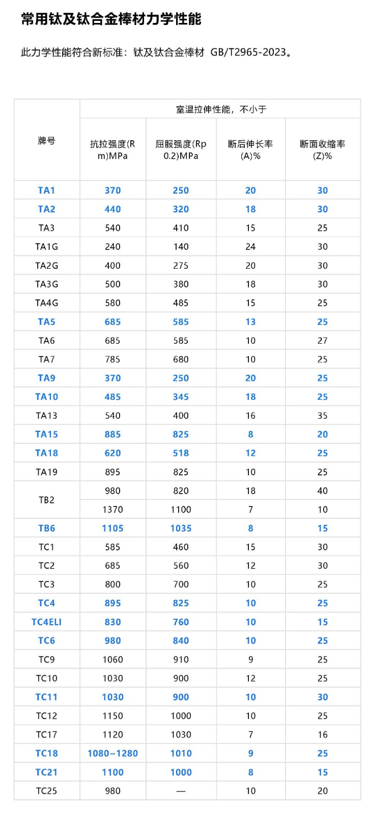 20世紀(jì)50年代以來(lái),鈦及鈦合金因具有優(yōu)異的綜合性能,得到了世界各國(guó)的高度重視,在各行各業(yè)獲得了廣泛的應(yīng)用。鈦合金牌號(hào)眾多,各種合金各有特點(diǎn),按合金類型主要分為α及近α型鈦合金、α+β型鈦合金和β型鈦合金。介紹各種典型鈦合金的物理性能和力學(xué)性能。